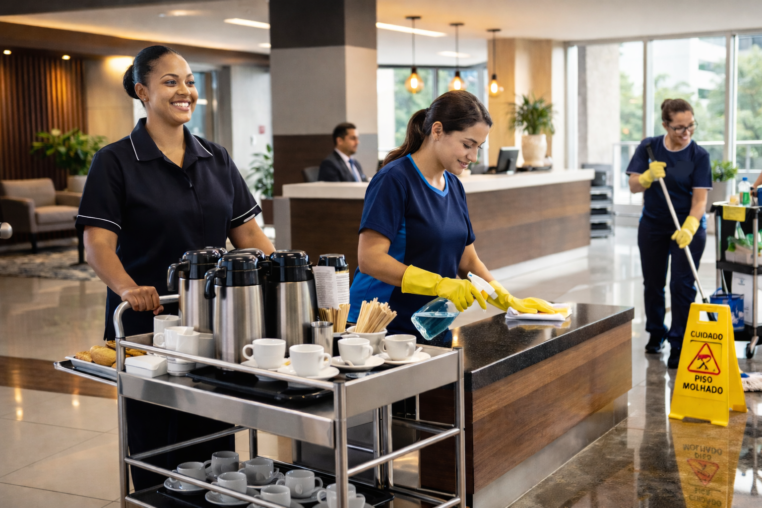 Cuidamos da limpeza, conservação, monitoramento e mão de obra especializada para que sua empresa tenha mais controle, segurança e foco no que realmente importa: resultados.